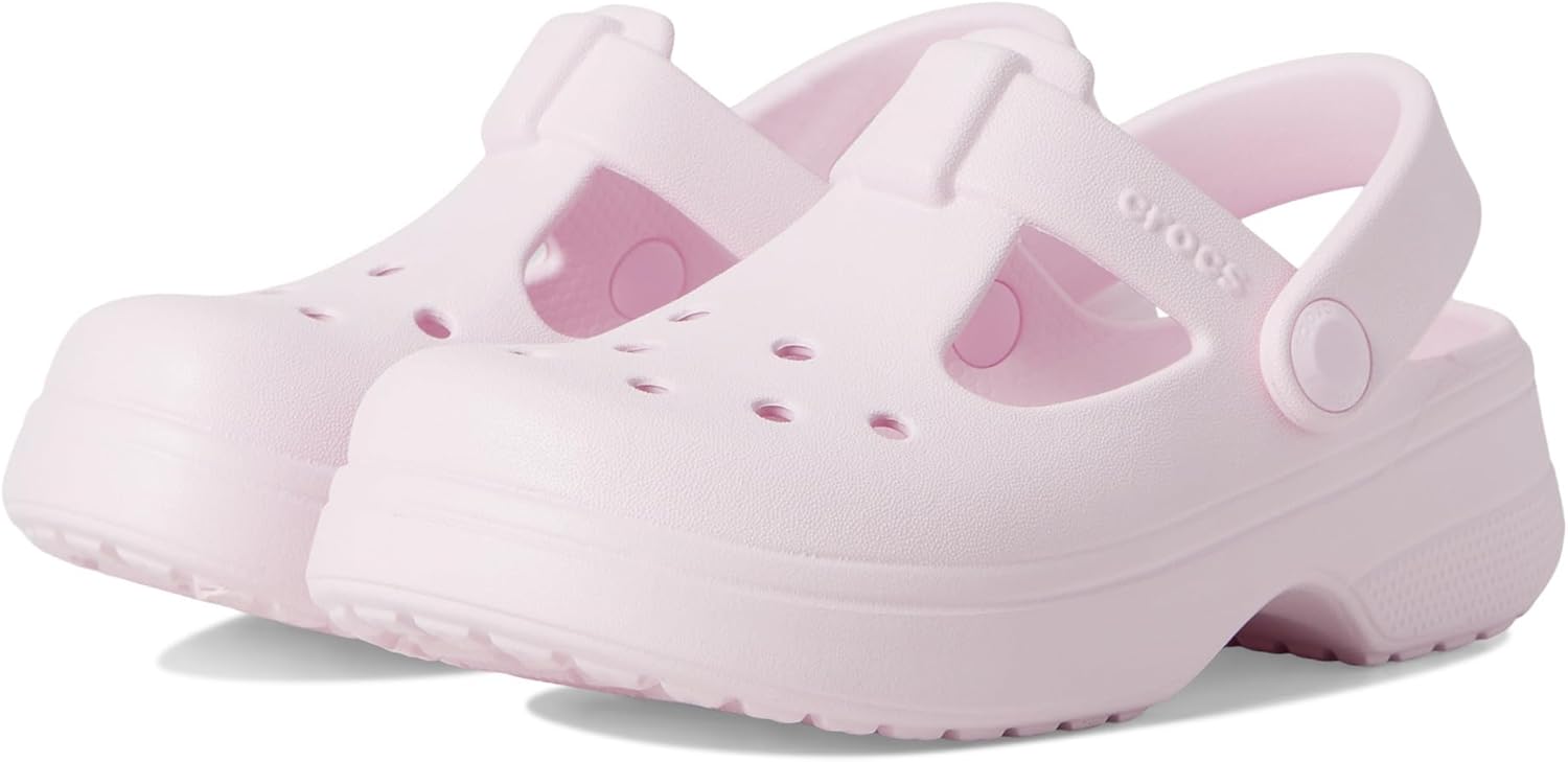 Lightweight kids Mary Jane clog by Crocs with cushioned Croslite comfort, breathable holes, secure strap. Easy to clean and water-friendly.