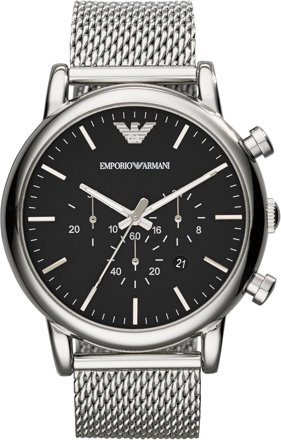 Emporio Armani men's chronograph, 46 mm case and stainless steel bracelet. Quartz precision and timeless Italian design.