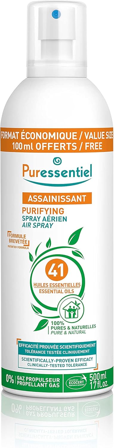 Respirez mieux avec le Puressentiel Spray Aérien Assainissant, concentré de 41 huiles essentielles 100% pures et naturelles. Son efficacité prouvée aide à réduire virus, germes et bactéries dans l’air tout en neutralisant les mauvaises odeurs pour une atmosphère plus saine.